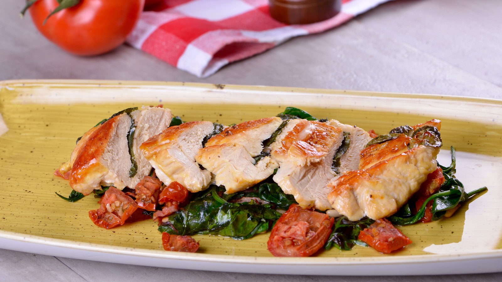 Pechuga de pollo al pesto con salteado de espinacas