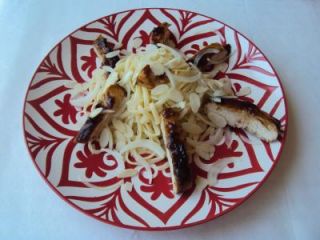 Pechuga de pollo glaseada con mermelada de naranja y balsámico sobre pasta fresca.
