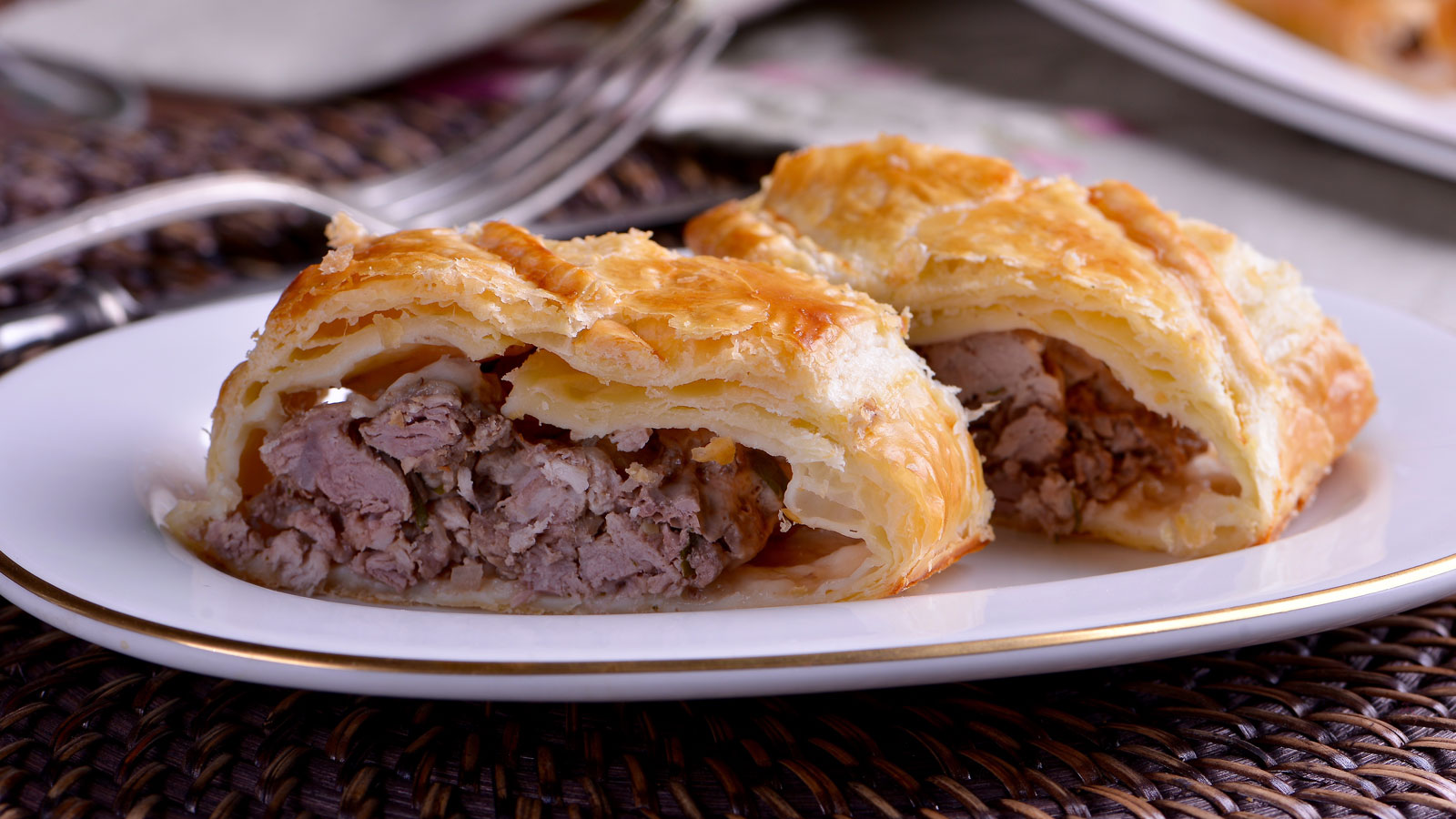 Doblamos los laterales del hojaldre encima de la carne, borde a borde, y terminamos doblando las puntas para cerrar el paté.