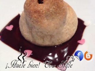 5.- Derretimos el chocolate en el microondas con un poco de margarina. Una vez este tibio, mezclamos con un chupito de Frangelico y repartimos en los platos de postre. Colocamos sobre él una pera y servimos.