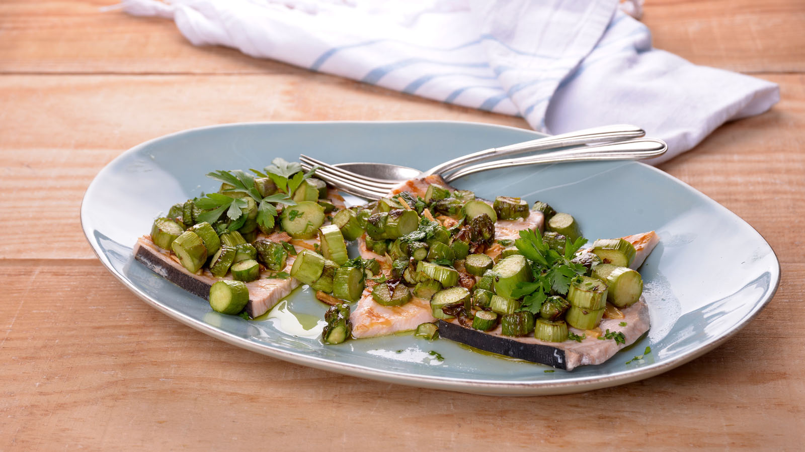 En el capítulo 83 del programa de televisión Cocina de Familia T4, la cocinera Elena Aymerich nos enseña a cocinar Pez espada con picadillo de ajos, espárragos y perejil.
