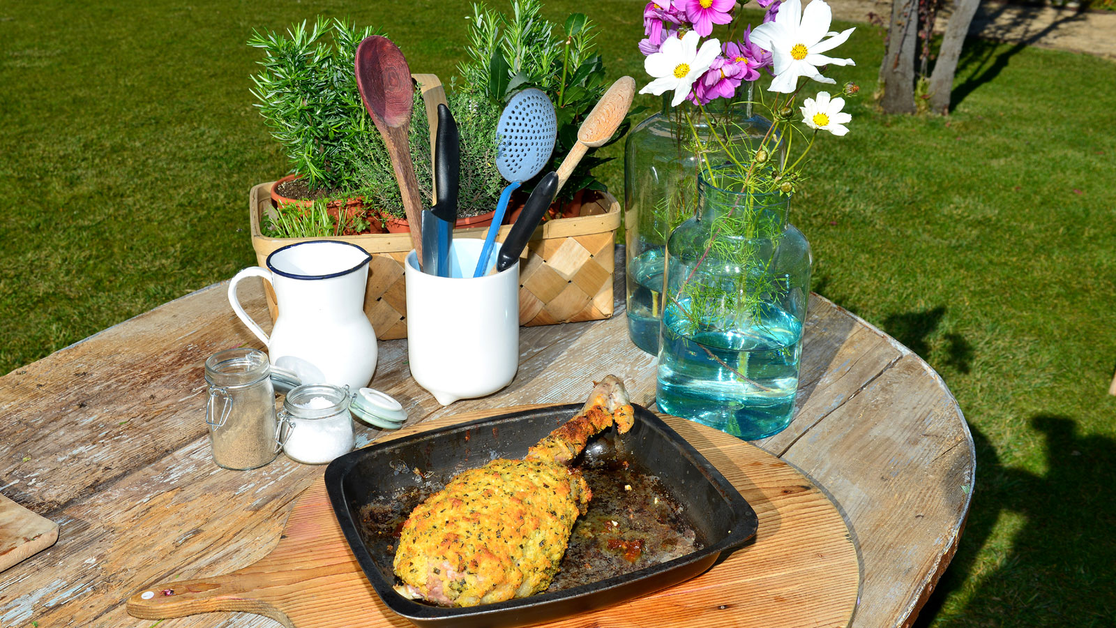 Seguidamente, en un bol mezclamos las hierbas trituradas con la mantequilla, el pan rallado y el parmesano hasta que quede una masa homogénea. Recubrimos bien la pierna de lechal con la masa de las hierbas.