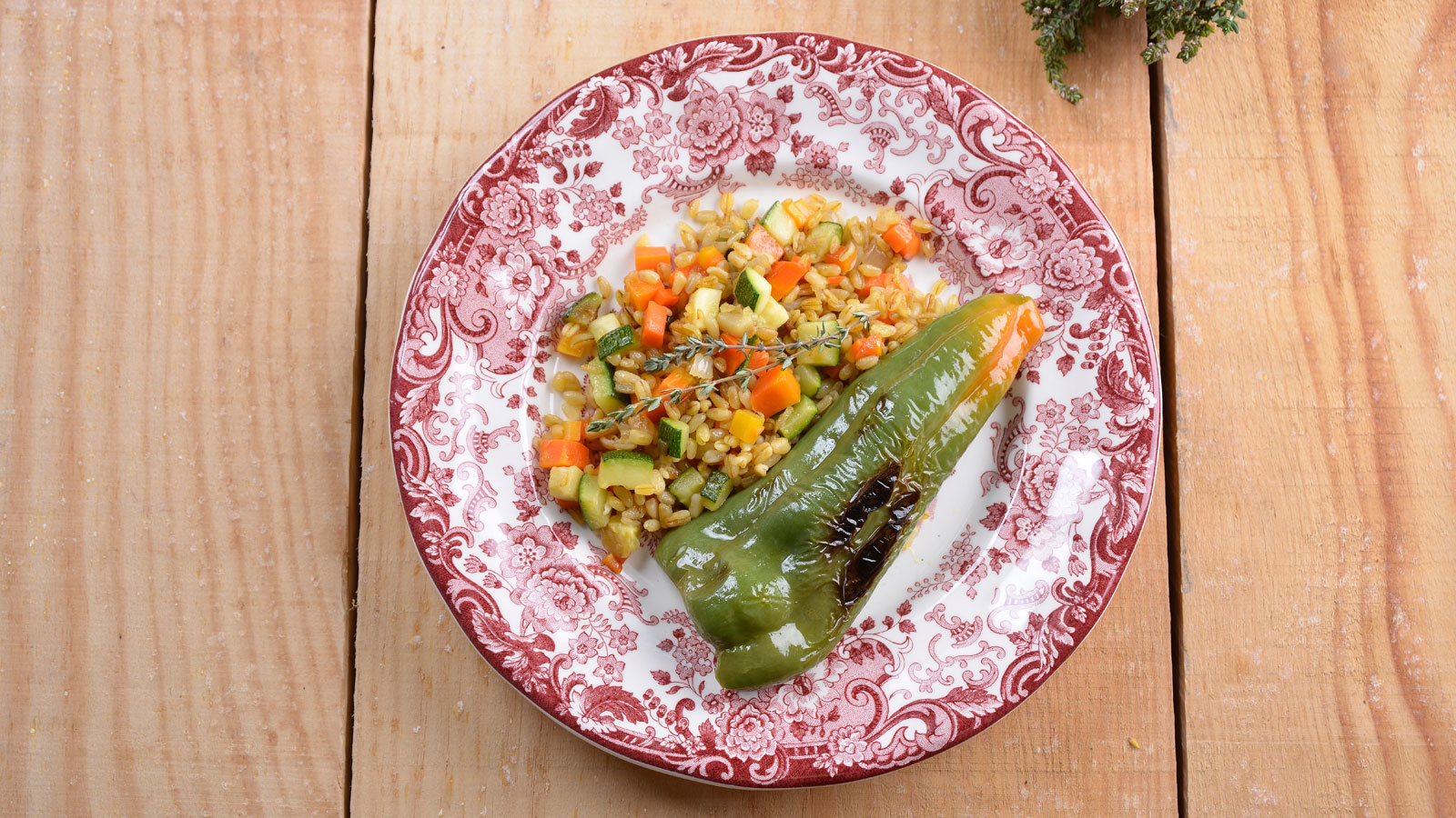 Seguidamente, añadimos los pimientos rellenos encima del trigo cocido. Decoramos con una ramita de tomillo fresco.