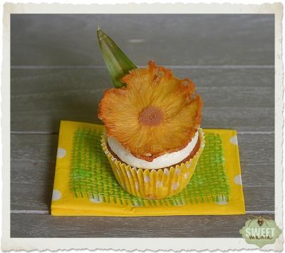 Mientras se enfrían vamos a hacer el frosting. En un bol batimos la mantequilla con el queso, cuando quede uniforme y cremoso añadimos el coco rallado, la esencia de ron y la crema de coco, volvemos a batir. Agregamos, tamizando, el azúcar glass y batimos. Pasamos a la manga y decoramos nuestros cupcakes y los coronamos con una flor de piña....o con trocitos de piña...o como mas os guste!!