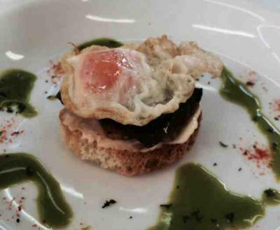 Tostamos el pan, mientras, freímos el beicon hasta q quede crujiente y el pimiento verde. Apartamos por separado. Freímos el huevo de codorniz. Una vez hecho todo, montamos en este orden, pan, beicon, pimiento verde y huevo frito.