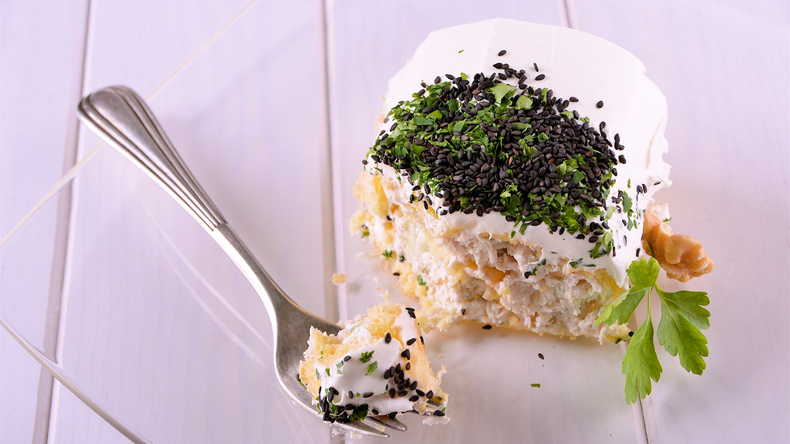 Enrollamos y terminamos cubriendo el pionono con queso crema y decorándolo con perejil fresco picado y sésamo negro.