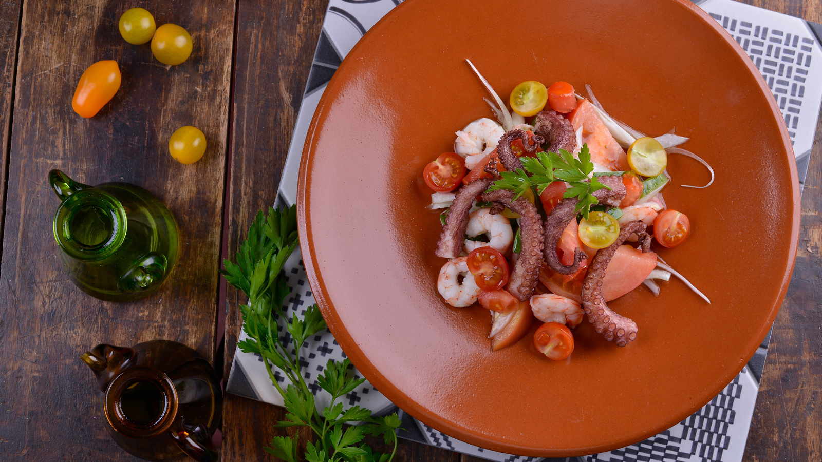 Servimos la pipirrana y colocamos encima las gambas, las patas de pulpo y los cherry y decoramos con perejil.