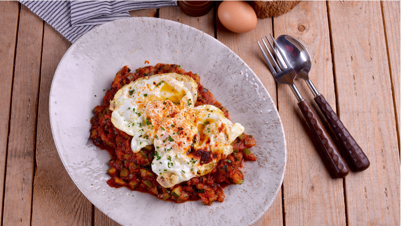 Freímos los huevos en una sartén con aceite caliente, incorporamos al pisto y emplatamos decorando con cebollino fresco picado.