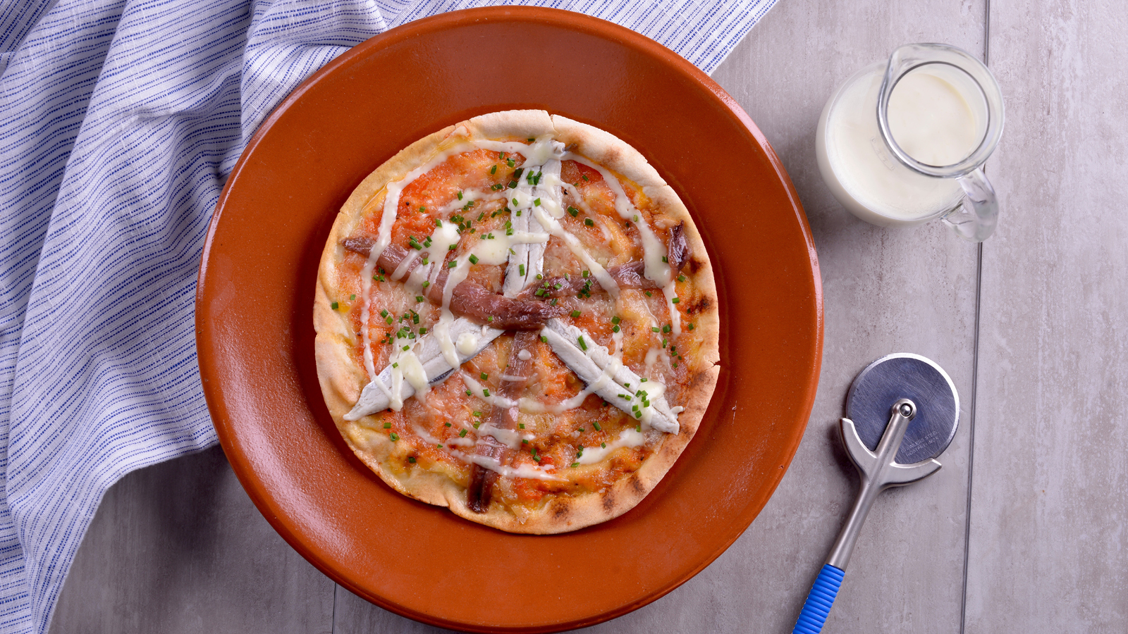 Tostamos en el horno y al sacarlo ponemos por encima anchoas, boquerones y una crema de queso que habremos preparado con nata e Idiazábal triturado. Espolvoreamos con cebollino picado y listo.