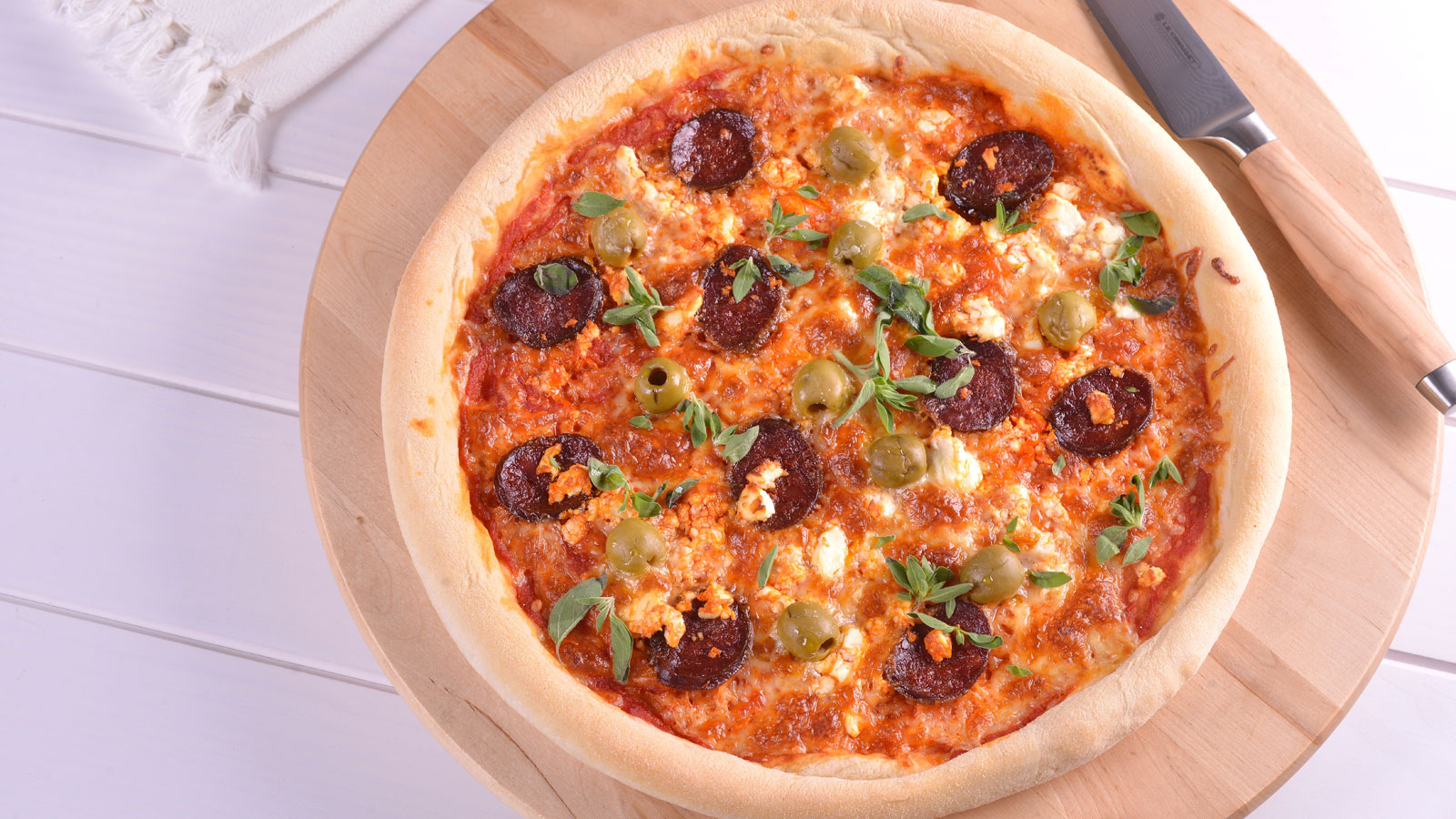 Para la pizza del Nono untamos la base con 150 g salsa de tomate, colocamos chorizo de cocinar curado cortado en rodajas, guindilla amarilla fresca sin semillas y cortada en rodajas, 50 g de queso feta desmigado, 200 g de queso mozzarella rallado, un poco de orégano fresco y unas aceitunas verdes.