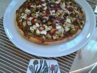 •Sobre la masa de pizza, se vierte salsa de tomate para cubrir la mayor parte de la masa, se pone la mozzarella rallada, se pone la carne picada de vacuno, media berenjena troceada en tacos (también se podría poner en lonchas),
