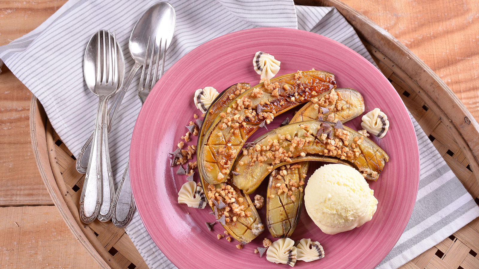 Servimos cada plátano con una bola de helado de vainillaalmendras garrapiñadas picadas.