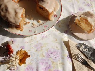 Mezcla el azúcar glas con la leche y la canela. Vierte esta glaseado encima del bizcocho. Deja secar el frosting.