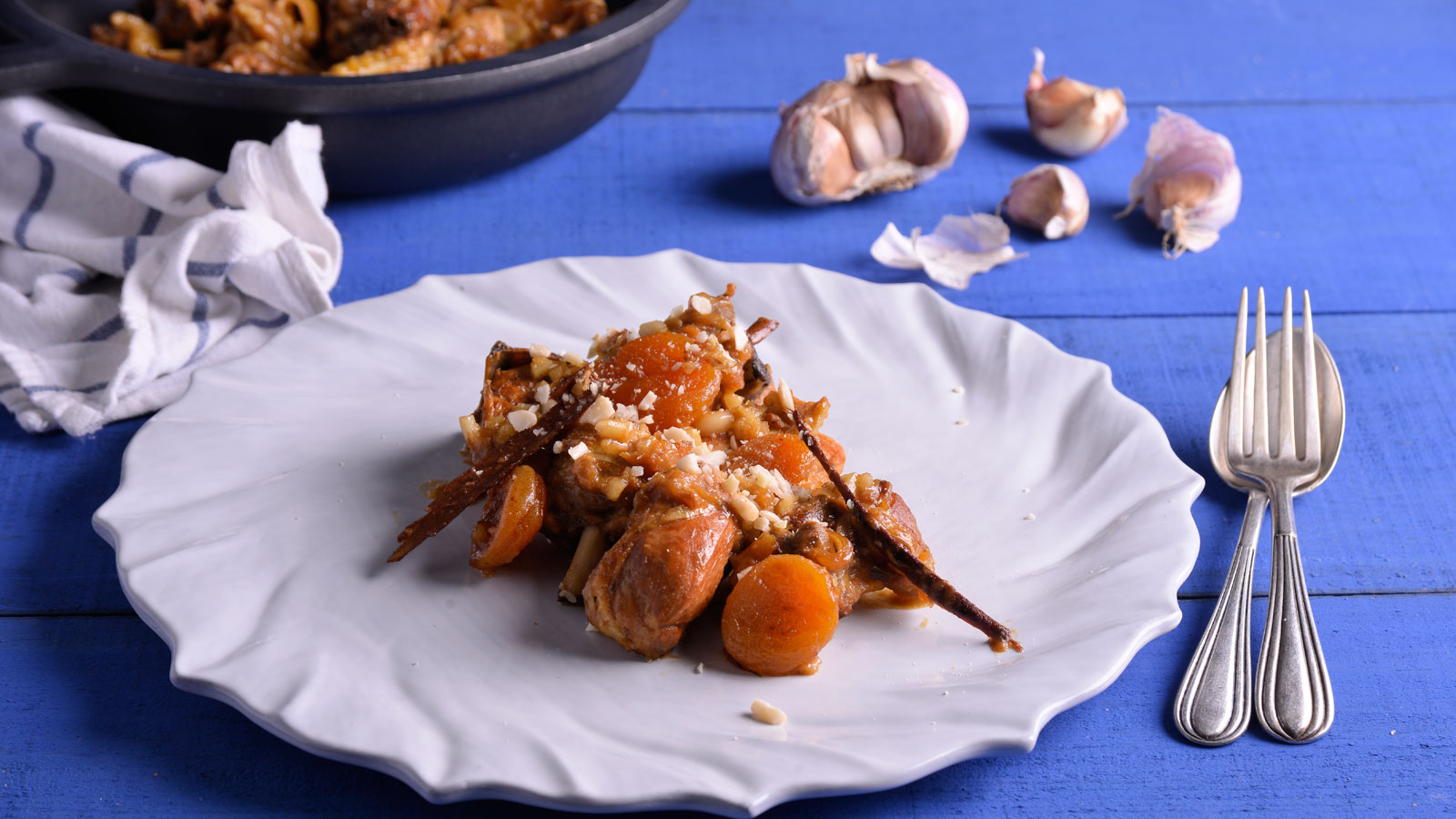 Emplatamos poniendo los trozos de pollo con la salsa de almendras y orejones. Decoramos con una rama de canela.