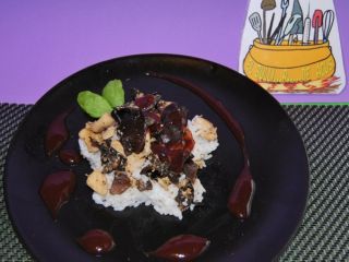 Pollo con setas chinas en base de arroz y vinagreta de frutos rojos