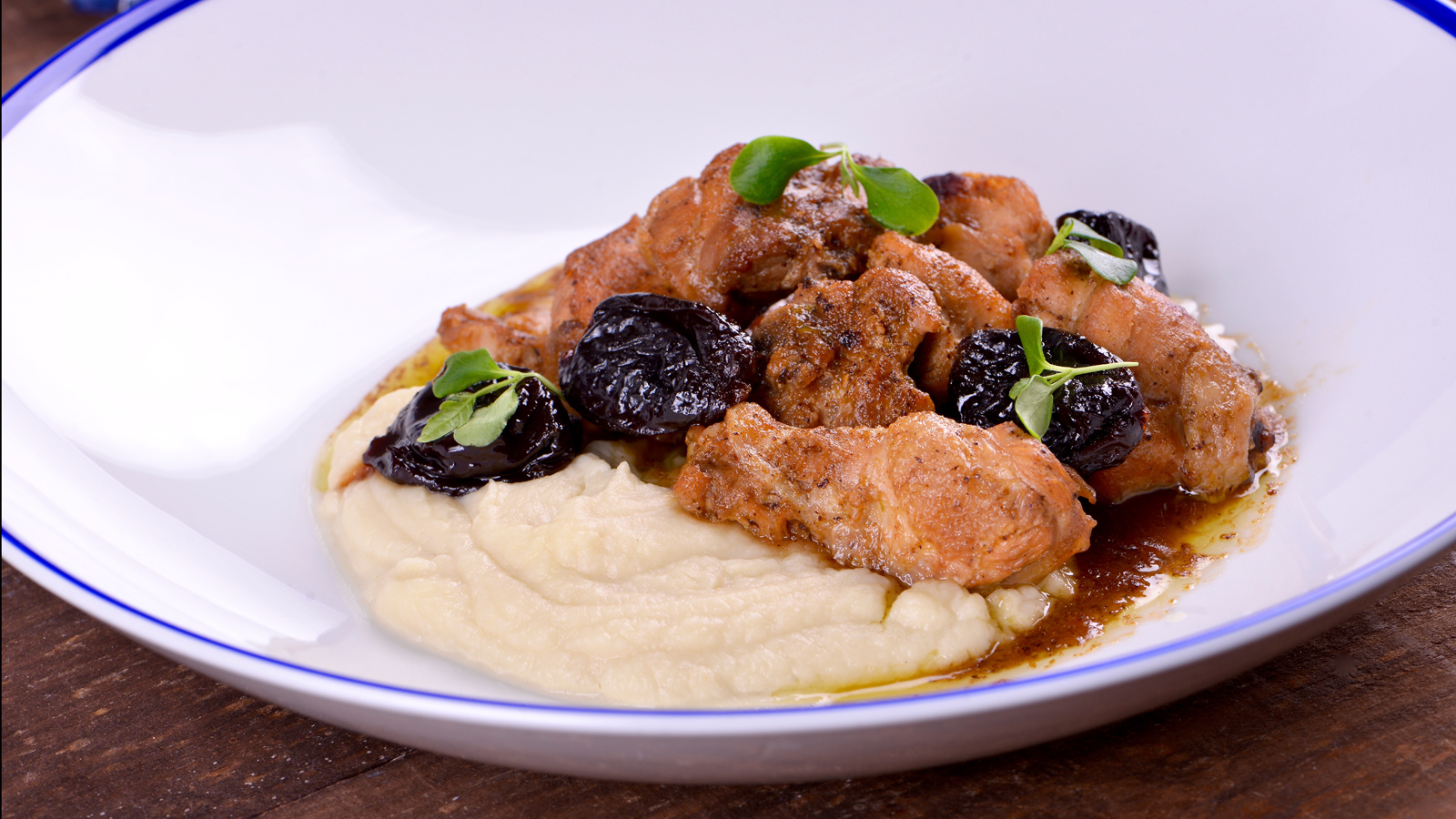 Servimos un poco del puré de manzana y apio, el pollo guisado y terminamos con las ciruelas.