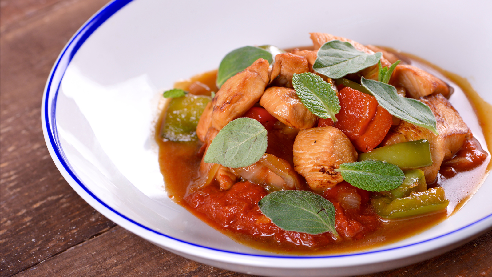Servimos unas cucharadas de tomate frito, el guiso de pollo y decoramos con orégano y hierbabuena.