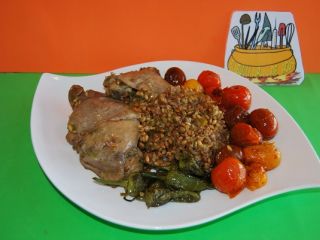 •Cuando el pollo esté hecho, se apaga el fuego y se presenta el pollo junto con el trigo sarraceno, unos pimientos del padrón y unos tomatitos cherry. Exquisito y sano.