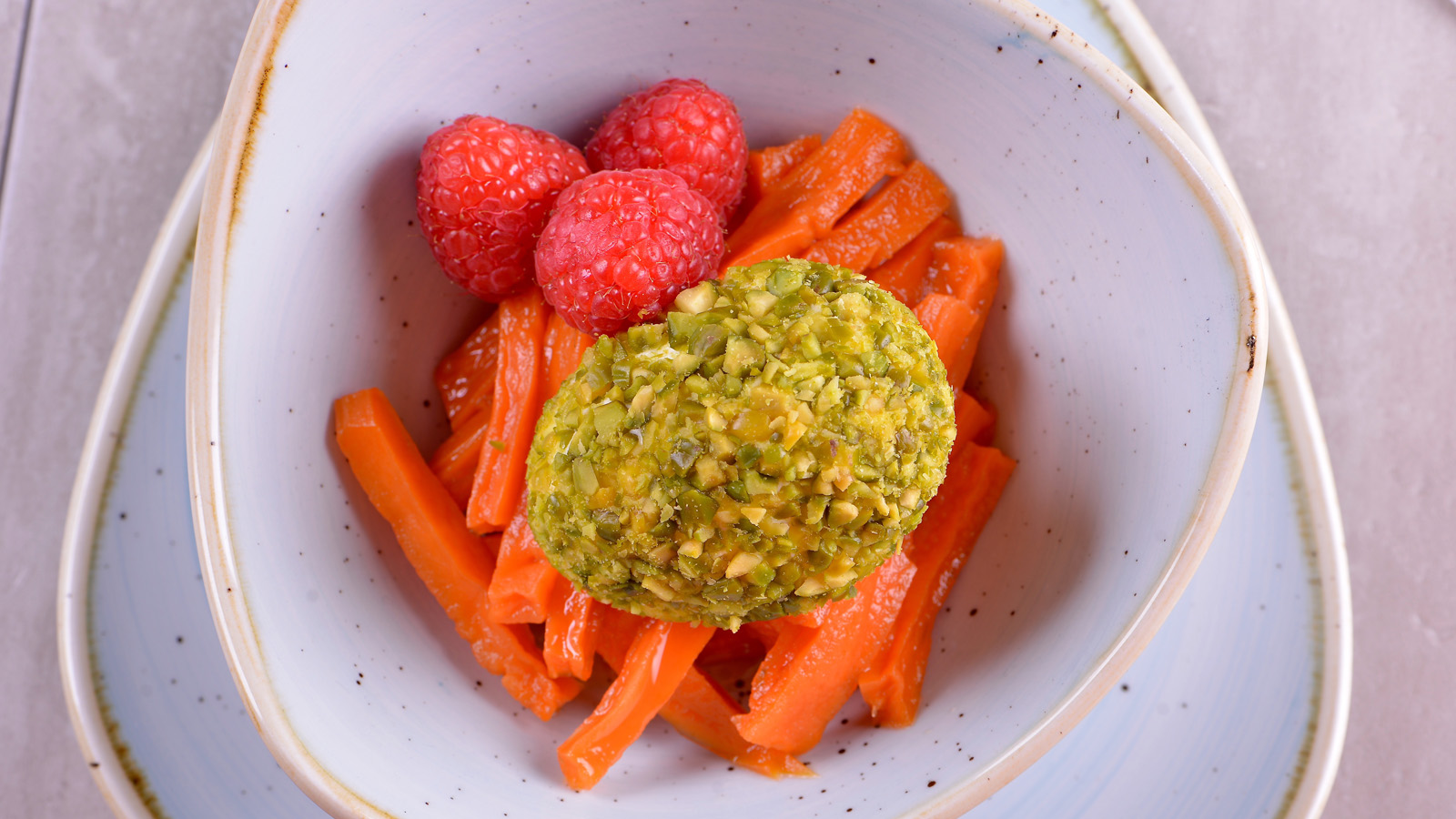 Servir con una bola de helado de leche merengada rebozada en polvo de pistachos y algunas frambuesas en crudo.