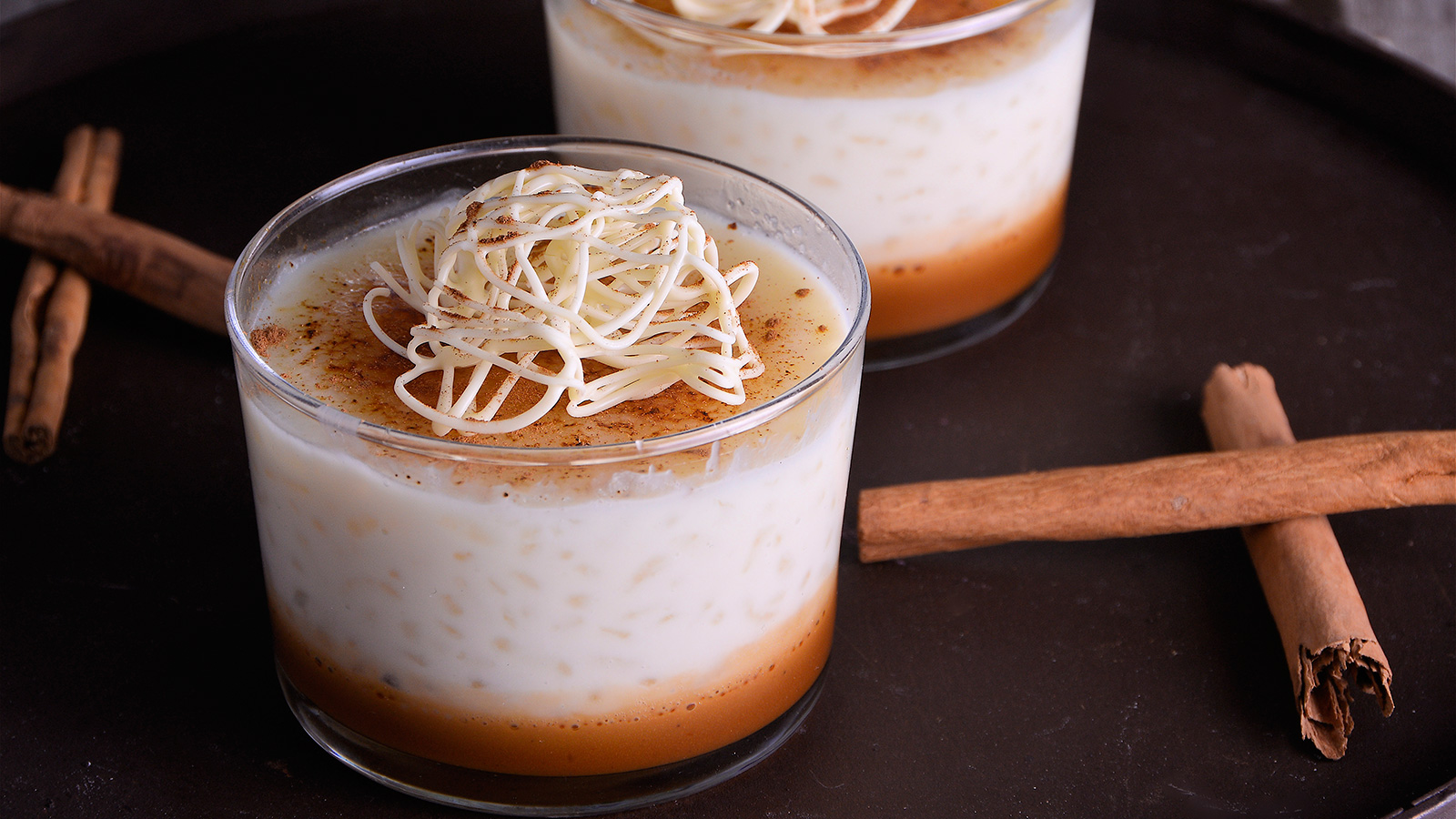 Postre en vaso de arroz con leche de chocolate blanco y paté de canela