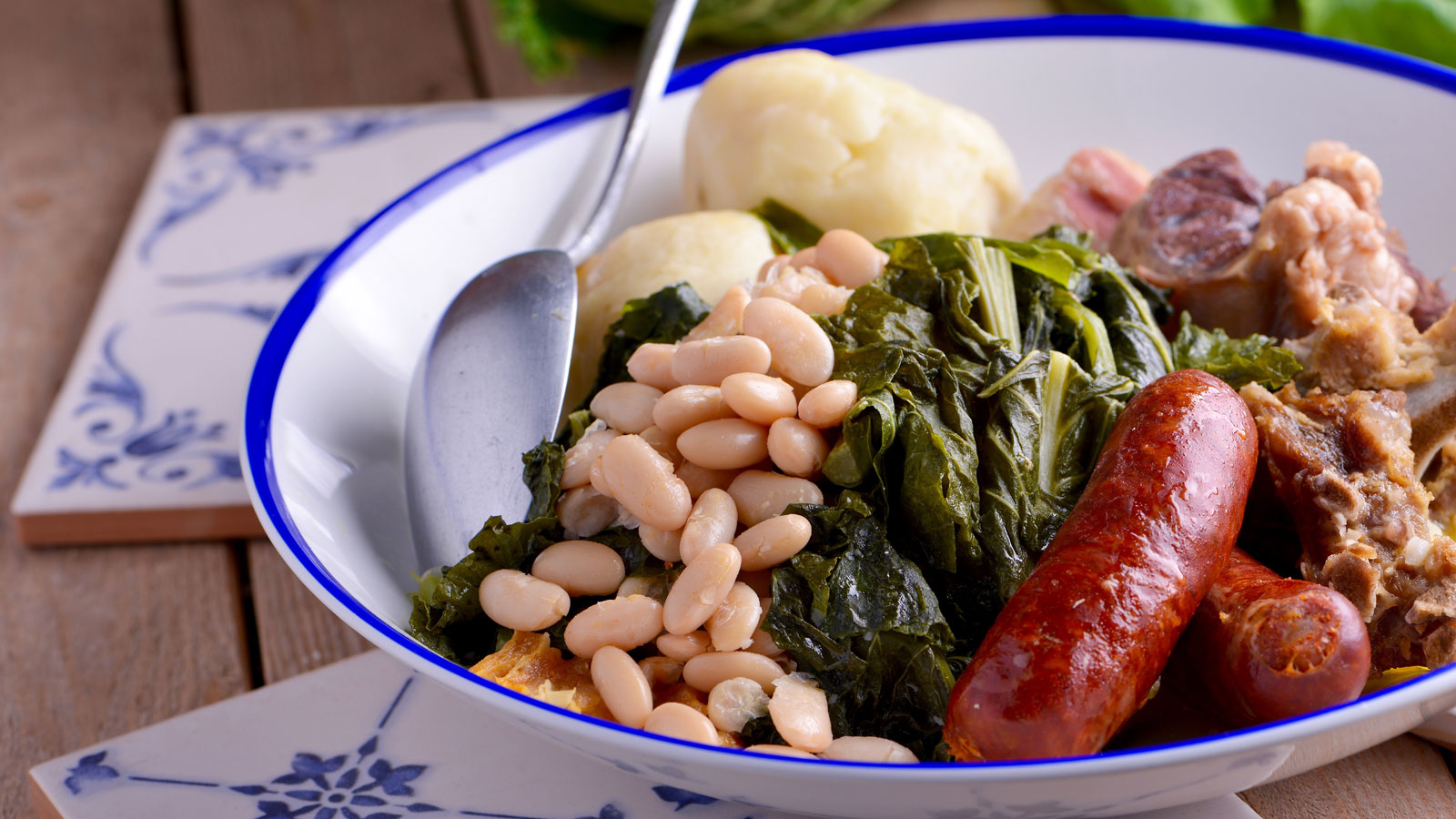 En la misma olla, iremos introduciendo también ¼ kg de berzas, ¼ kg de grelos y 4 patatas gallegas para que se cuezan durante una hora aproximadamente.