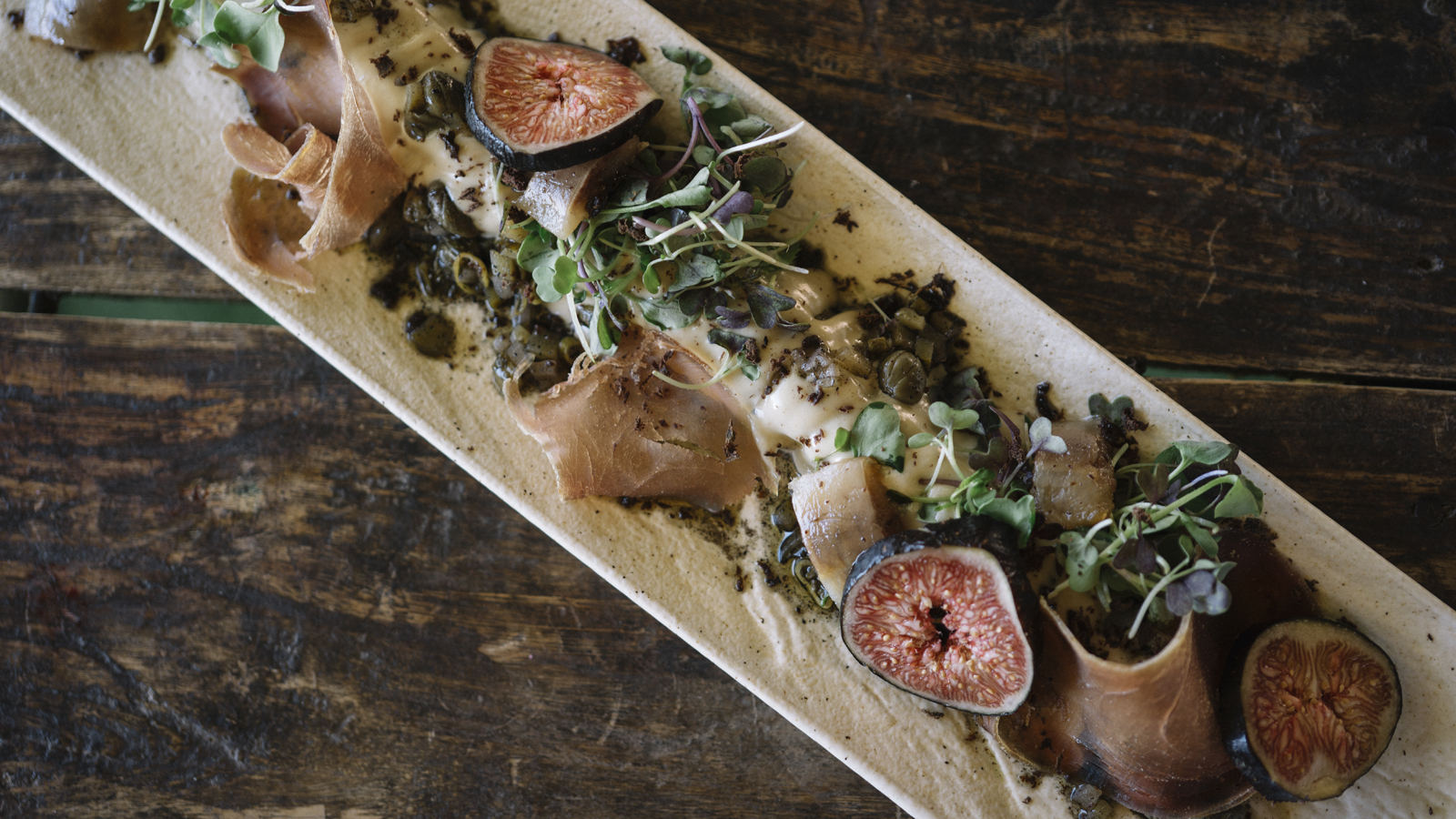 Acompañamos con las lonchas de mojama, unos brotes verdes, unos trozos de sardina en lata, y rallamos por encima el corazón de atún. Decoramos con unas rodajas de breva.