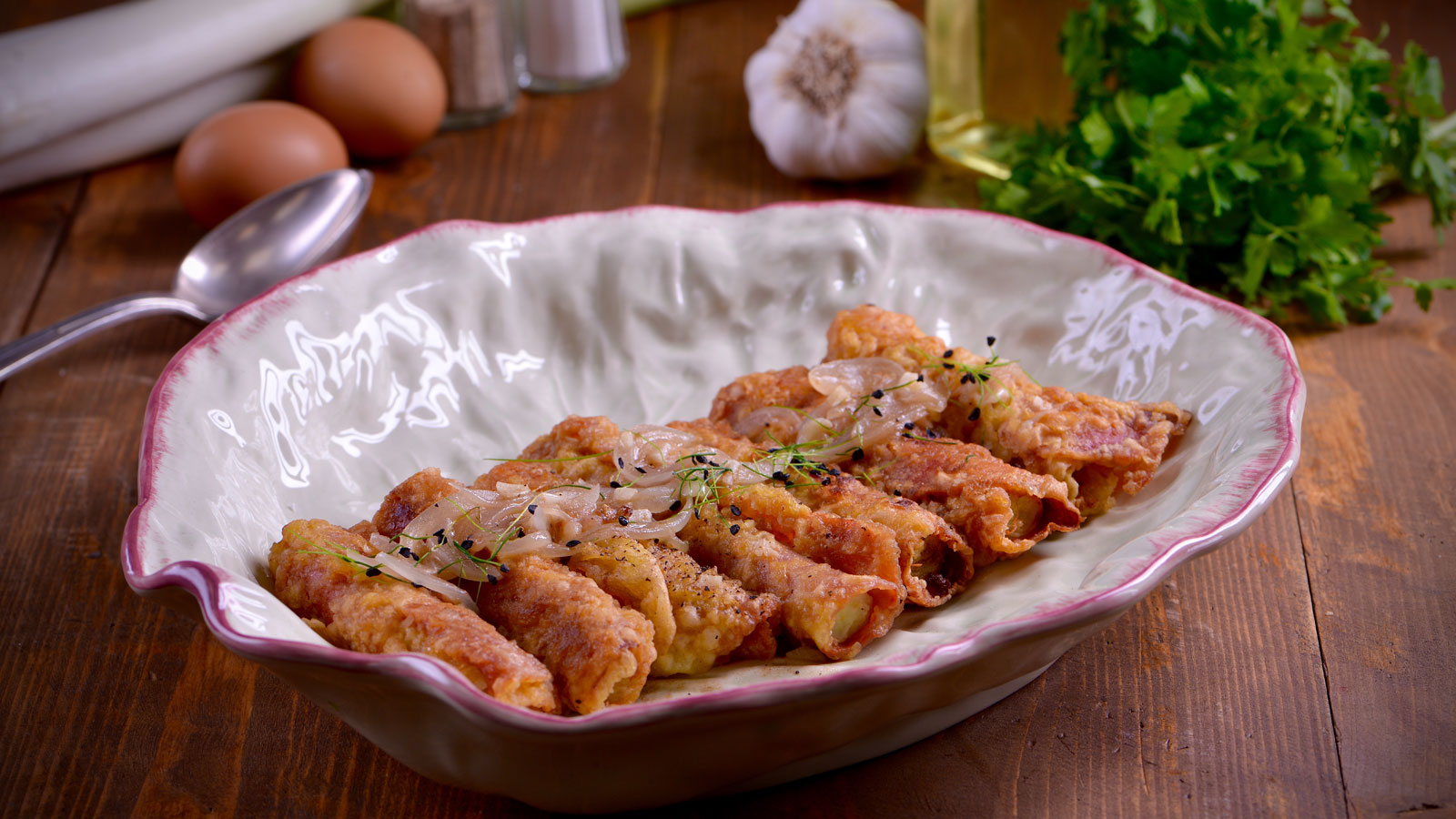 En el capítulo 4 del programa de televisión Cocina con Blanca, Blanca Mayandía prepara la receta de Puerros rebozados en su salsa.