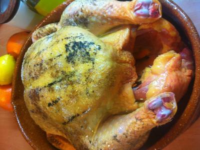 Se deja otra media hora más y se va regando con sus jugos. Si se dora mucho la superficie se puede colocar encima de la pularda un papel de aluminio.