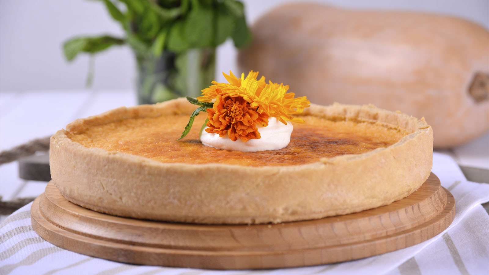 Decoramos el centro de la pumpkin cake o tarta de calabaza con la nata montada. Decoramos con una flor y servimos.