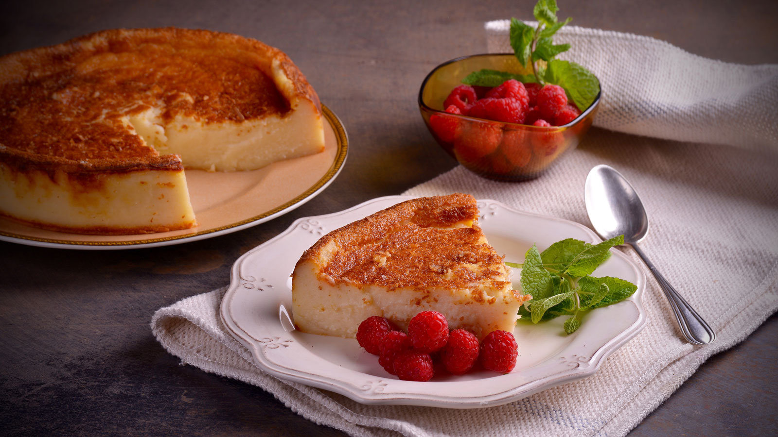 Pasado el tiempo de horneado, le damos la vuelta a la quesada y la desmoldamos sobre un plato. Decoramos con hojas de menta y unas frambuesas.
