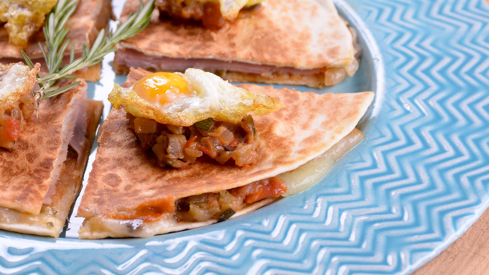 Quesadillas de pisto y queso manchego con huevo de codorniz