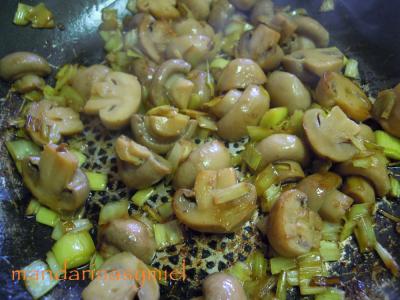 Pica el puerro y sofríelo en el mismo aceite del secreto hasta que esté tierno, añade los champiñones y sigue friendo hasta que se vaya el agua que sueltan . Reserva.