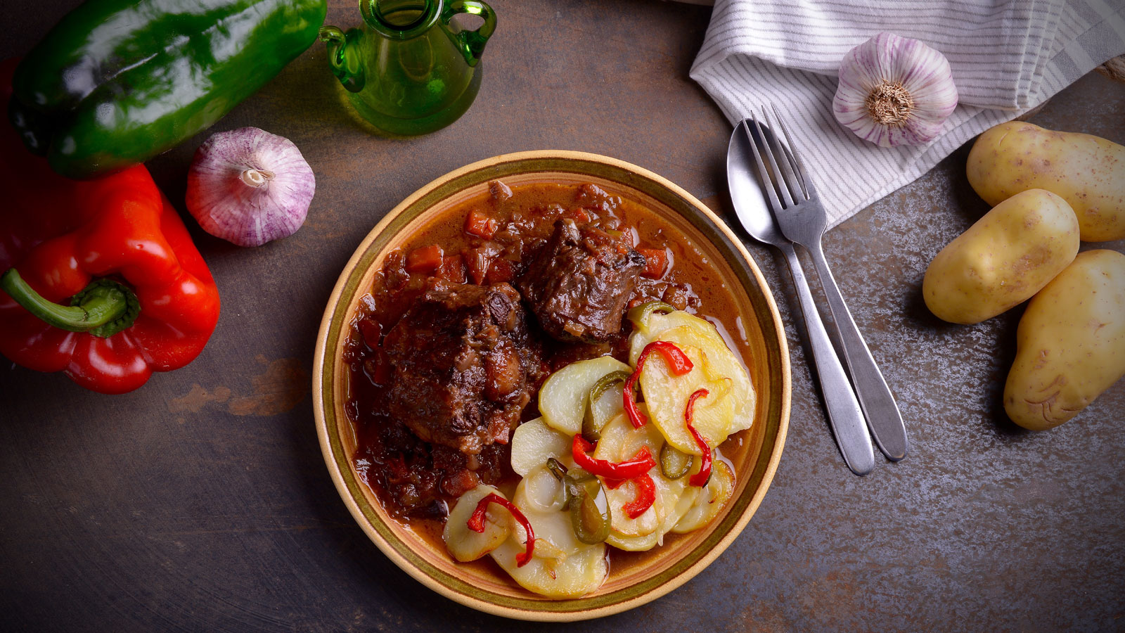 Cuando la carne esté lista, disponemos las patatas sobre una fuente para servir y sobre ellas, colocamos el guiso.