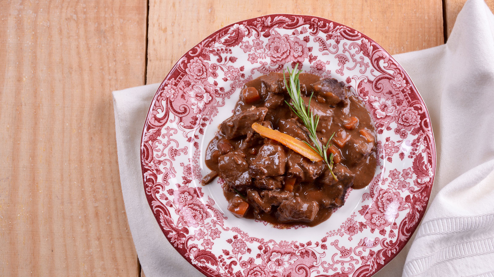 Emplatamos el ragout de ternera con salsa de chocolate en una fuente grande. Decoramos con unos trozos de zanahoria y unas ramitas frescas de romero.