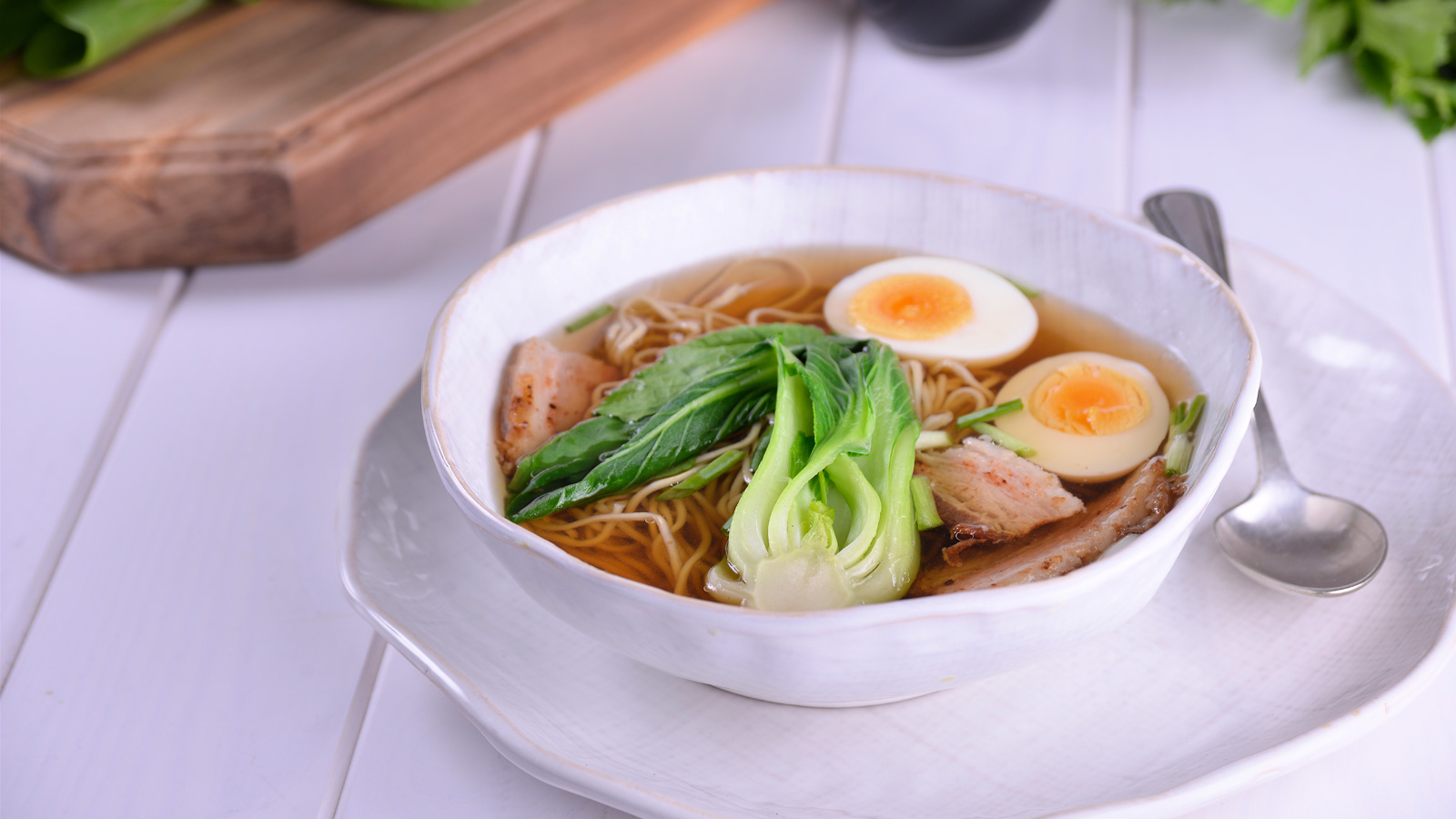 Emplatamos en un plato hondo el caldo, los noodles, el pack choi, el huevo cocido cortado por la mitad y la panceta.