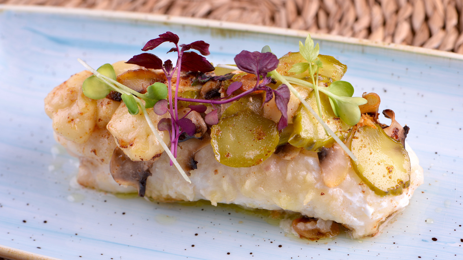 Cortamos los champiñones y los pepinillos en láminas y los colocamos sobre el rape.