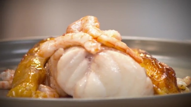 Rape con gambas al cava y puerros asados y glaseados
