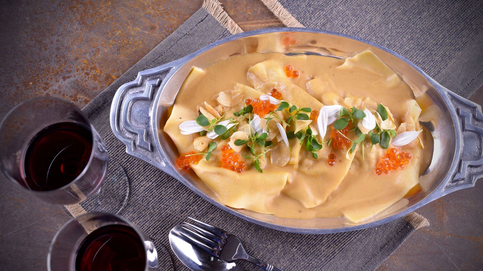Cuando estén cocidos los raviolis los emplatamos en un plato hondo. Servimos el caldo por encima. Decoramos con unas huevas, unas hojitas de sakura, chips de ajo y algunas flores rojas.