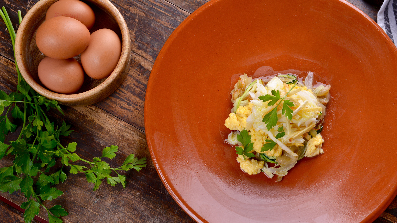 En el capítulo 570 del programa de televisión Cocinamos contigo T3, Sergio Fernández prepara la receta de Revuelto de calabacín y bacalao.
