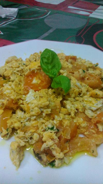 Rehogamos unos instantes y echamos los huevos. Sazonamos con sal y pimienta y revolvemos durante unos minutos hasta estar cuajados, según gusto del comensal.