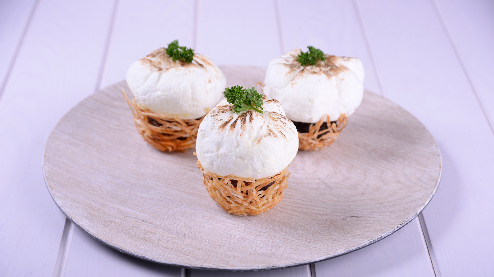 Emplatamos los nidos de patata y le añadimos en la base una capa de cebolla caramelizada, otra de chorizo, y por encima, el huevo. Quemamos un poco el huevo con un soplete para que tenga un color dorado. Decoramos con el perejil.