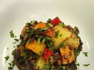 salpimentamos y ponemos orégano, pasados 5 minutos, añadimos los champiñones troceados y limpios, y envolvemos, añadimos el vino serrada y las patatas cocidas y troceadas. Dejamos se evapore el alcohol del vino mientras removemos.