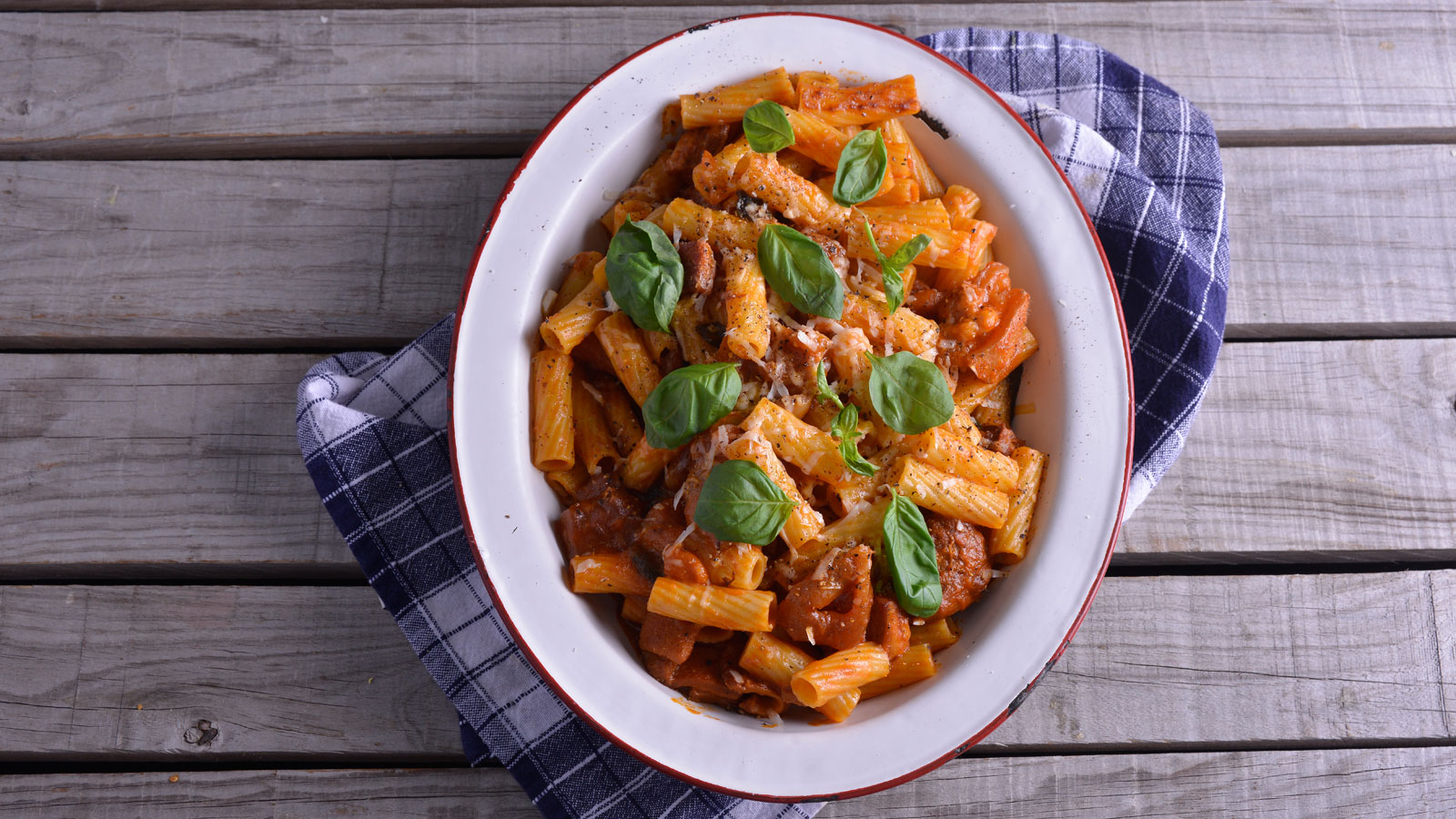 Por otra parte, ponemos una olla al fuego con agua y sal y cocemos los rigatoni hasta que estén muy al dente. En ese momento, los escurrimos y los añadimos al cazo de los callos.