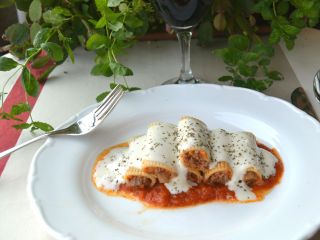 Añadimos las hierbas secas como el orégano, albahaca etc; como la salsa de tomate ya está hecha anteriormente dejamos unos 5 minutos que haga un ''chup-chup' muy suave .Luego colamos la salsa boloñesa guardando sus jugos y ponemos la carne dentro de una manga pastelera. Por último rellenamos los rigatoni. Finalmente ponemos los jugos de la carne en un cazo y los llevamos a hervir. Mientras diluimos en una taza de café un poco de leche fría y una cucharada de postre de maízena y cuando hierva la salsa le vamos añadiendo poco a poco la maizena para que espese la salsa y tenga textura de bechamel ligera.