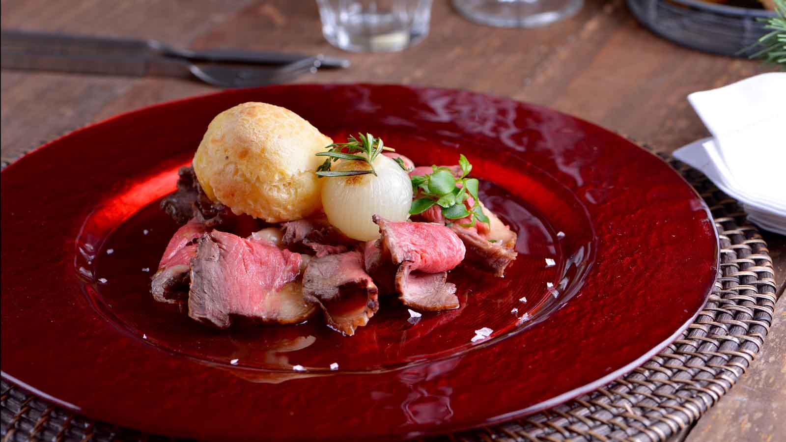 Servimos el roast beef con unas cebollitas glaseadas y acompañamos con el pan de queso.