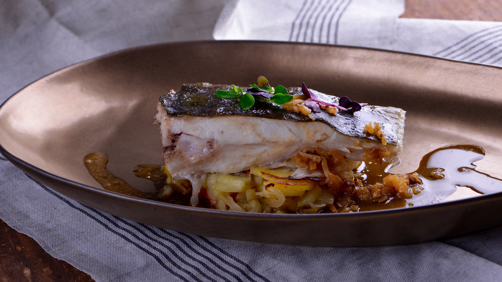Servimos la cama de patata y colocamos encima un trozo de rodaballo, la salsa de sidra y decoramos con unos germinados.