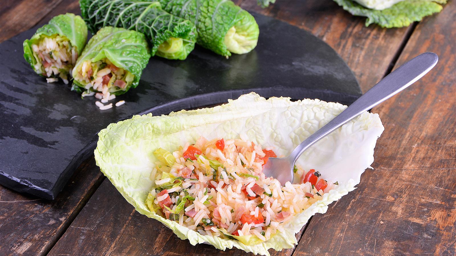 Extendemos las hojas de berza y las rellenamos con la mezcla. Cerramos en forma de paquetitos.