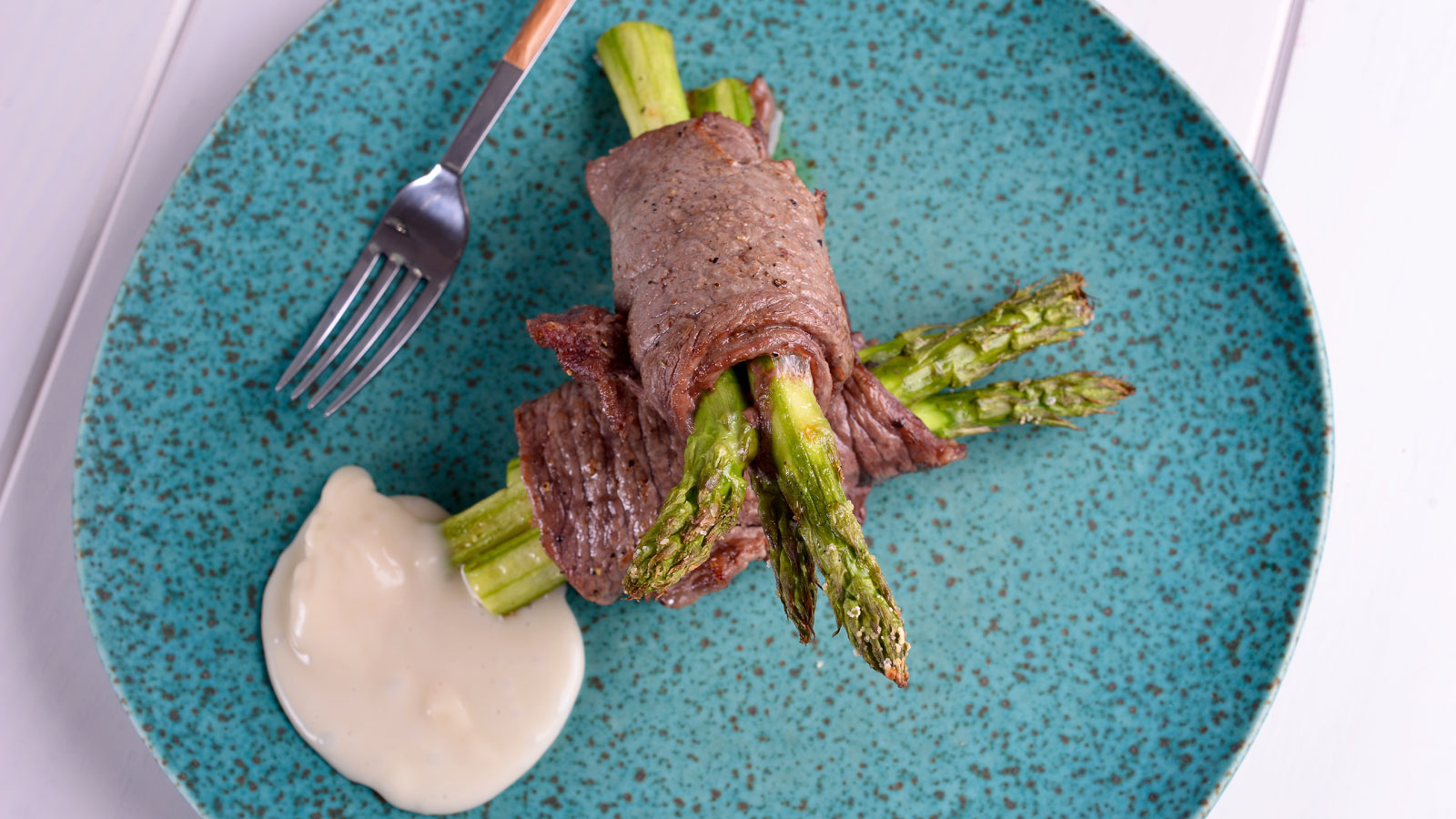 Colocamos en el centro unos espárragos trigueros, el pimiento caramelizado y una cucharada de torta del casar.