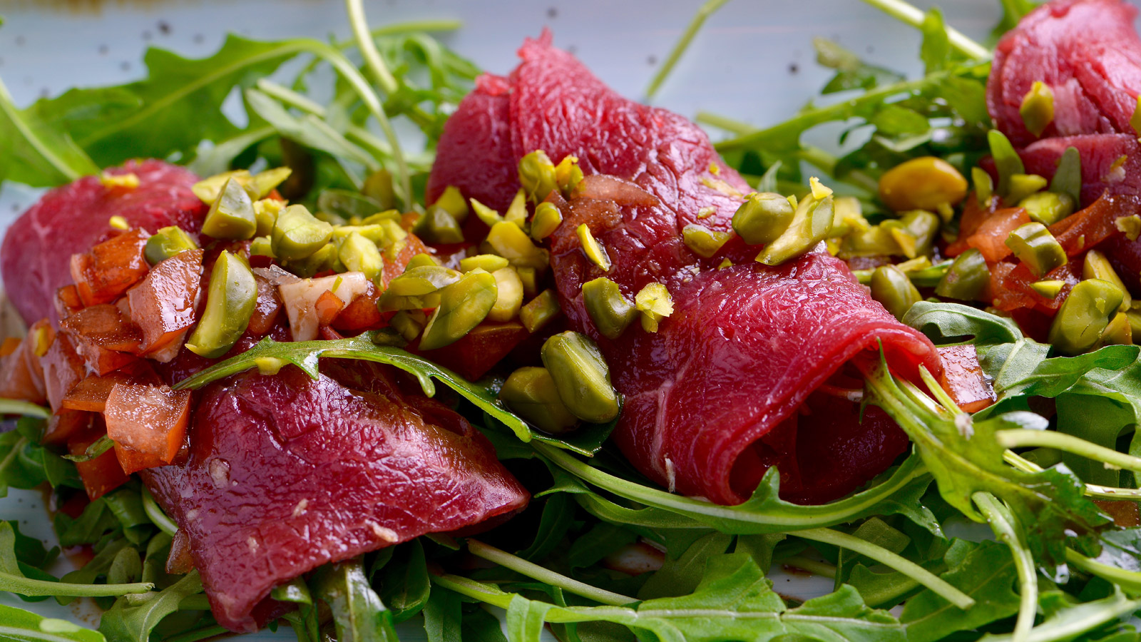 Rollitos de carpaccio de ternera con vinagreta de pistachos