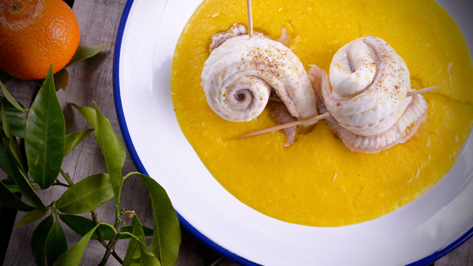 Rollitos de lenguado con aromas frutales sobre crema ligera de pimiento amarillo